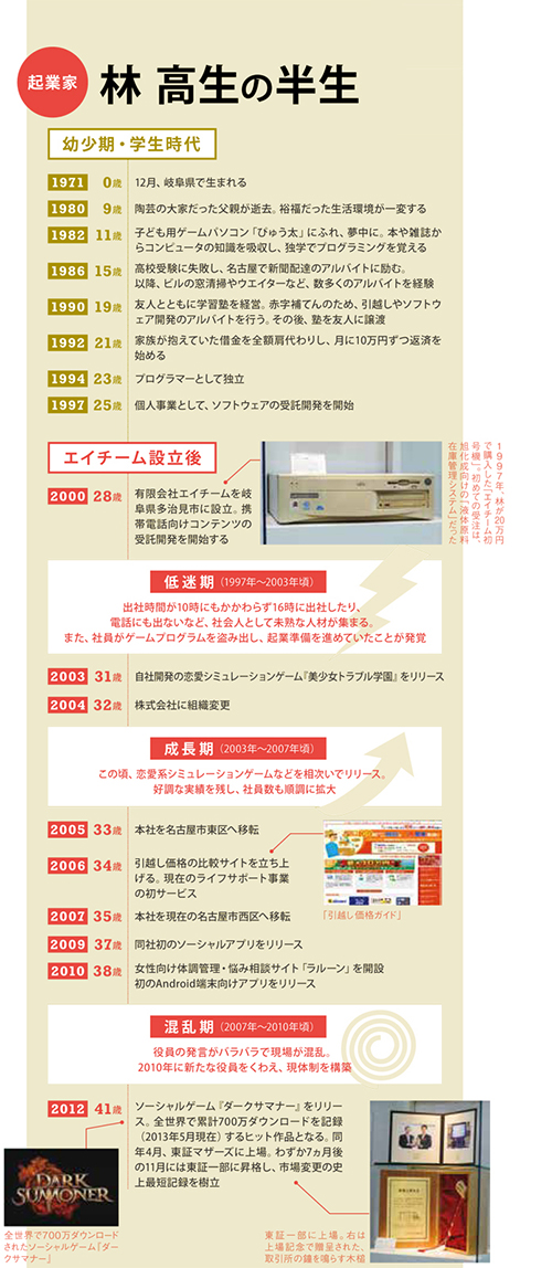 リリースから1年3ヵ月で全世界のダウンロード数が700万を超えた『ダークサマナー』を開発。マザーズ上場から史上最短の233日で東証一部へ昇格――。名古屋市に本社を構えるエイチームは、いまもっとも注目を集めるITベンチャーのひとつだ。しかし、創業から6年間は業績低迷が続き、先が見えない状態であったという。どのようにして会社を立て直し、ヒット作品を生むことができたのか。代表の林氏に聞いた。