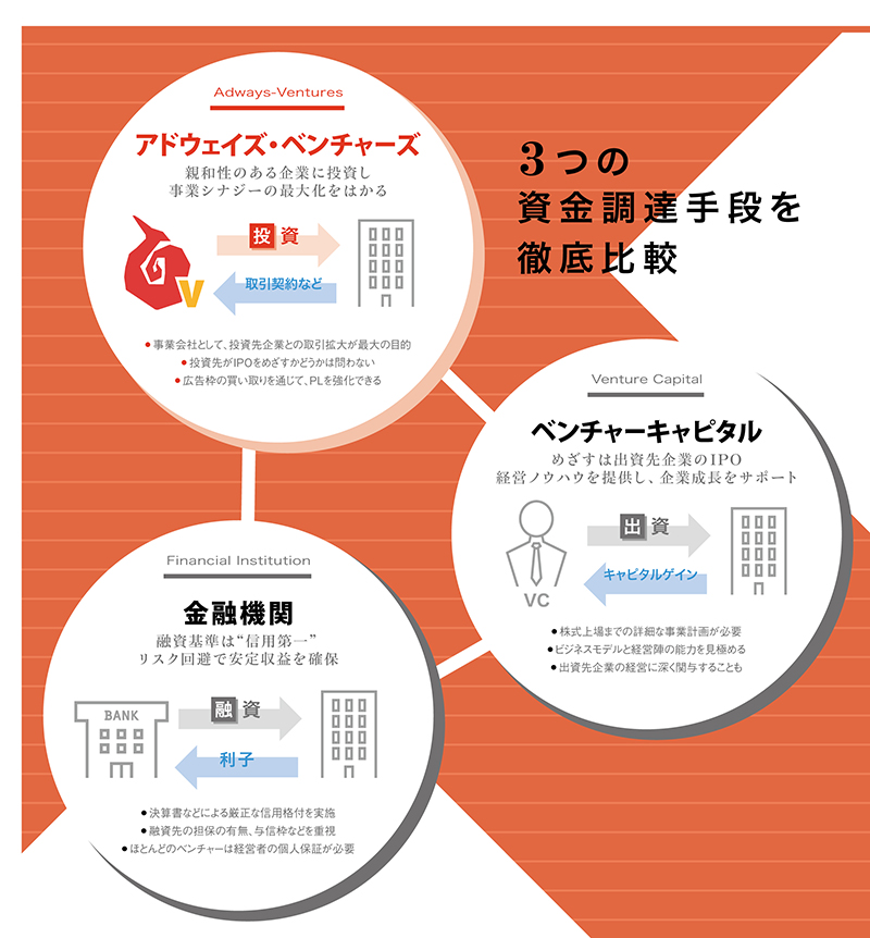 アーリーステージのベンチャーが資金繰りの苦労から脱却した途端、成長軌道に乗る場合がある。業績好調なベンチャーも、追加資金を得ることでさらなる飛躍を実現するケースは多い。アドウェイズの100%子会社であるアドウェイズ・ベンチャーズは、これまで複数社に出資・提携を実施。数々のベンチャーを成長に導いてきた。同社は従来のベンチャーキャピタル(以下、VC)とも銀行融資とも、まったく違ったスキームで資金を提供する。ベンチャー経営者が注目すべき新しい資金調達のカタチを解き明かしていく――。
