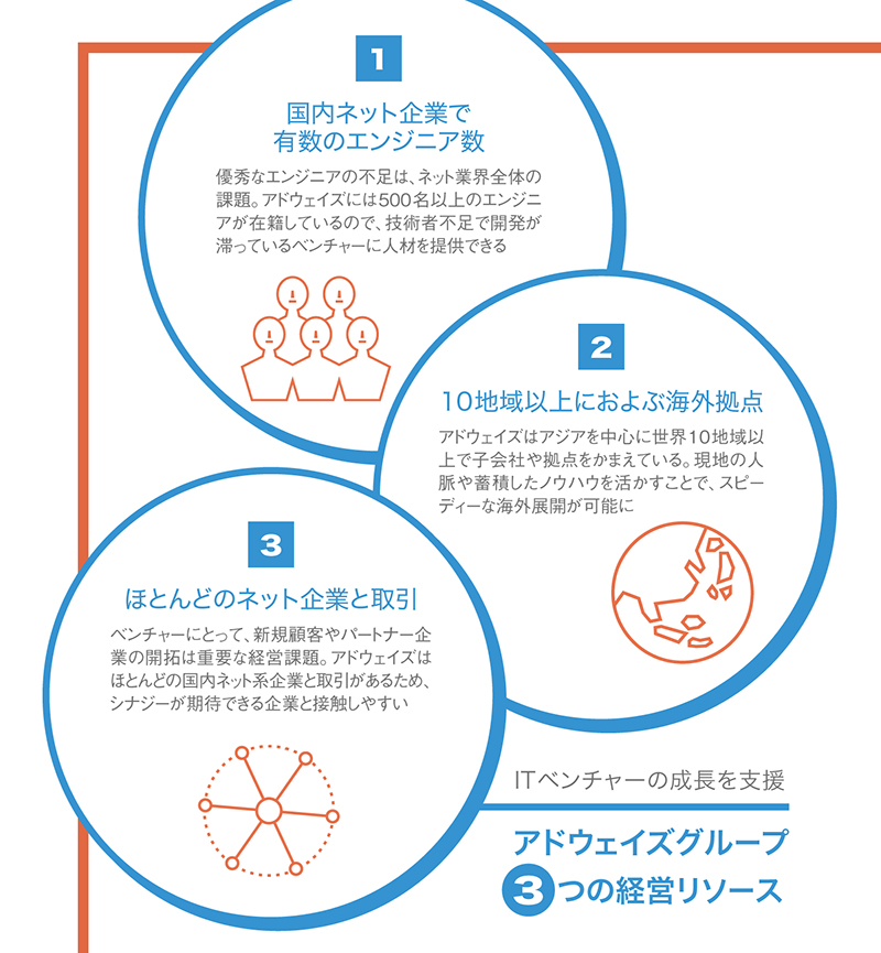 岡村:開発リソースを提供しています。アドウェイズは従業員1,100名のうち、500名以上がエンジニア。これほどのエンジニアをかかえているITベンチャーは、国内に数社しかありません。技術者不足で開発が進まない企業には、人材を派遣するケースもあります。また、当グループはアジアを中心として10以上の海外拠点を展開。この現地リソースを利用することで、通常なら1年ぐらいかかる業務を1~2ヵ月に短縮できます。さらに、アドウェイズはほとんどの国内ネット系企業と取引があるため、シナジーがありそうな企業を紹介することが可能です。