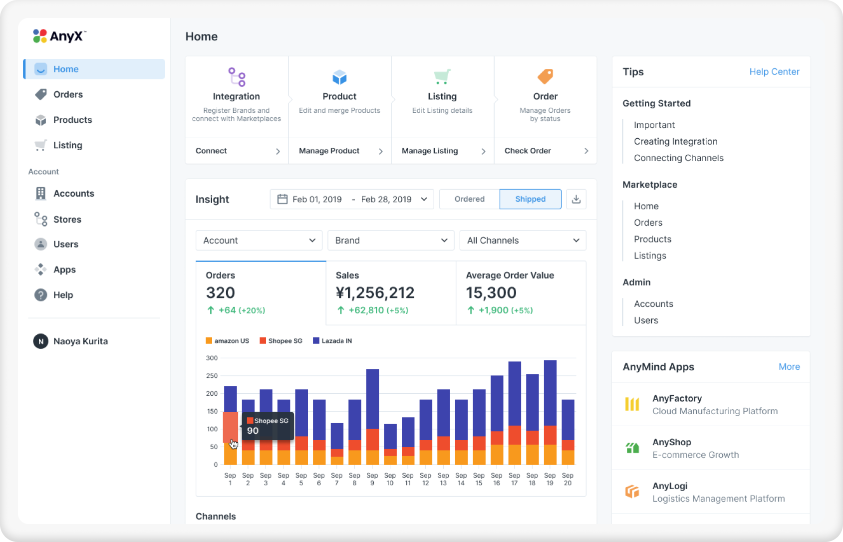今年4月に「AnyX」という新しいプロダクトを、1年弱の開発期間を経てようやくローンチすることができました。これは複数のECチャネルを一元管理できるプラットフォームです。Amazonをはじめ、日本の楽天やYahoo!、インドのFlipkart、東南アジアのShopee、LazadaなどあらゆるECサイトの販売を1つのプラットフォームでリアルタイムに管理できるようにしました。