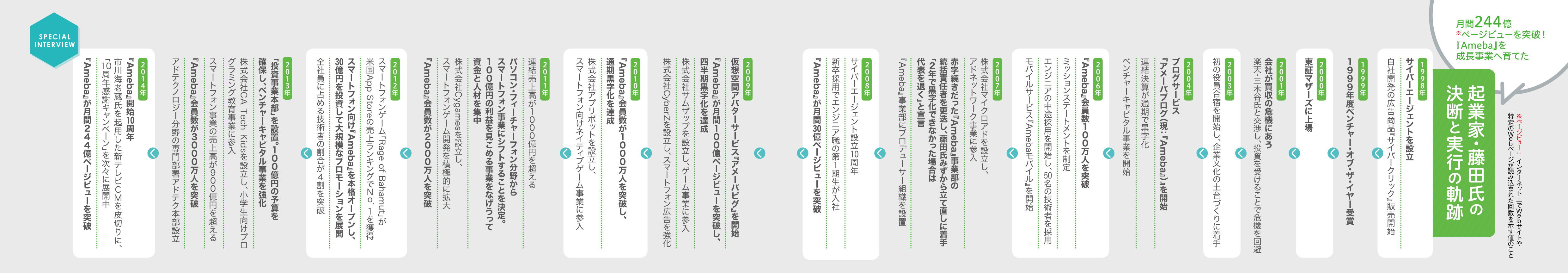 藤田:端的にいえば、マイペースに経営を行ってきたことです。振り返れば、当社は時代ごとにさまざまな紹介のされ方をしてきました。ITバブルのときは、「ビットバレー」をけん引するベンチャーの1社として。「ヒルズ族」という言葉が流行ったときは、その代表格として私の名前とともに頻繁にとりあげられました。六本木じゃなく、渋谷にいるのに(笑)。そして現在は、『Ameba』やゲームを運営する会社として広く認知されています。こうしてみると、つねに攻めの経営をしてきたようにみられがちですが、そんなことはありません。たとえば世間が浮ついているときでも、インターネットという成長産業から軸足をぶらさず、つねに地に足をつけた経営を心がけてきたのです。消えていった会社の多くは違いました。マスコミに大きくとりあげられ、多くの投資家がつき、人材採用も成功する。すると、浮足立ってしまうんです。新規事業に必要以上の投資をしたり、ムリに規模の拡大を図ったりして、成長を急いでしまう。結果、足をすくわれてしまうのです。