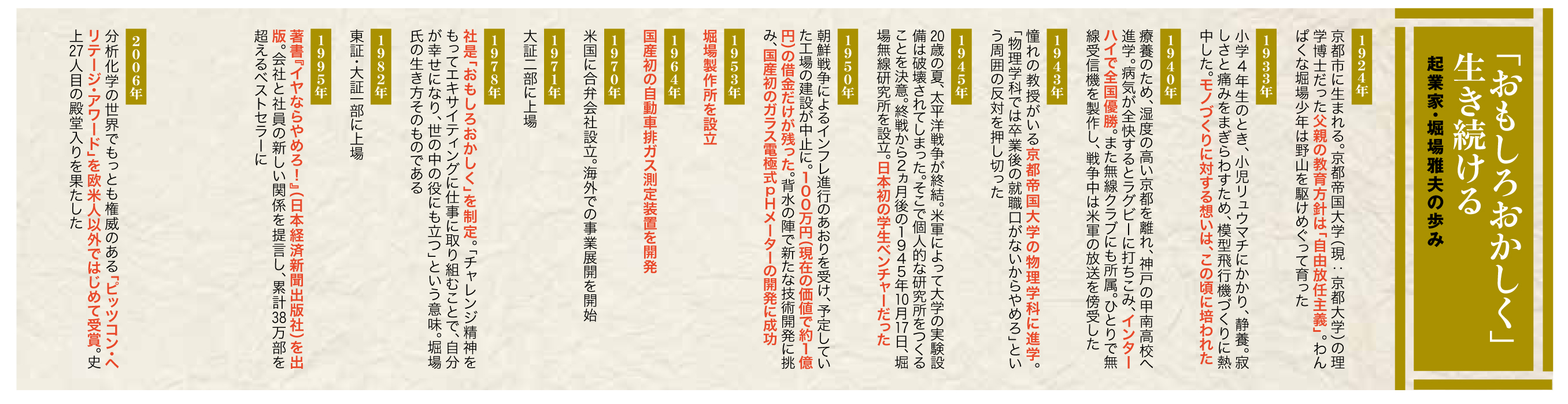 1945年10月、敗戦から2ヵ月後に京都で産声をあげた堀場無線研究所。20歳の京大生だった堀場雅夫氏が立ち上げた。1950年に国産初のガラス電極式pHメーター(トップ画像)を開発。それをきっかけに1953年、堀場製作所を設立。いまや分析・計測機器のトップメーカーとして、世界27ヵ国に拠点をもつ売上高1,000億円超の巨大グループへと発展した。京都から世界市場を制することができた理由はなにか。ニッポンの学生起業家の草分け、堀場氏に聞いた。