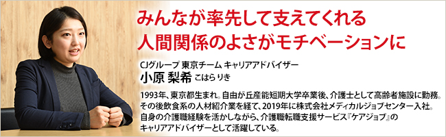 介護分野の求職者支援を行っています。私も以前、介護職をしていたので、利用者さんに自分の経験を話せるのは信頼関係を築くうえで強みだと思います。実際、最初はかなりそっけない反応だった利用者さんがいるのですが、よさそうな職場をなんども探して提案しているうちに、「ここまで信頼してくださるのか」と思うほどの良好な関係を築けました。日中は忙しくて電話に出られな利用者さんも多いので、メールなどでこまめに連絡を取ることを大事にしていたのも、よかったかもしれません。入社して1ヵ月弱で、記念すべき初めての成約を獲得しました。
