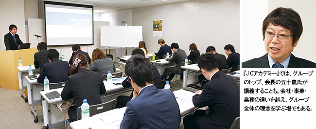 一方で、コングロマリット経営をしていると多種多様な事業が混在することになりますので、どういったグループなのかがわかりにくくなってしまう側面があります。 そこでそれをおぎなうため、『JCアカデミー』という階層別の育成カリキュラムを開設しました。能力や生産性を高めるというだけではなく、「人をブランディング化させる」ことを目的のひとつとして取り組んでいます。グループ各社の社員が組織横断的に時と場所を同じくして研修を受けているので、人材交流・事業連携の面からも非常に好評です。