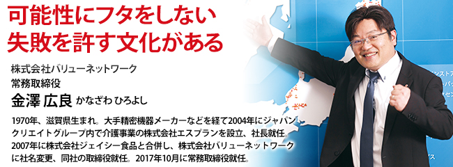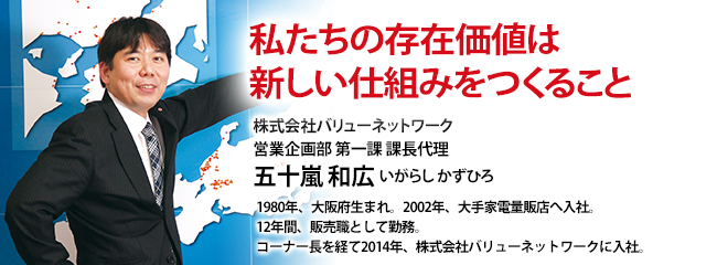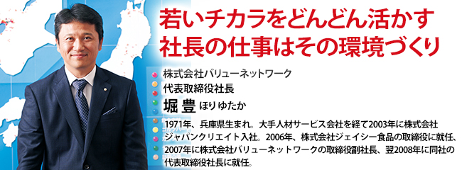 業務用スーパーやドラッグストアのなかに精肉店や青果店を出店する方式で、全国に約300店以上を展開するバリューネットワーク。ジャパンクリエイトグループにグループインした後、業容を急拡大させ、グループ第2の事業に成長した。ここでは代表の堀氏以下、4名のメンバーを直撃。急成長の要因に迫った。