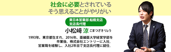 はい。自分でも驚いています。就活の際に代表から直接、「手をあげれば、責任ある仕事をどんどん任せる」と説明はされていたんですが、早くも2年目で支店長代理というポストを任せられるとは、正直思っていませんでした。会社が成長して、全国に拠点が広がっているいまだからこそ、入社間もない自分たちにもチャンスが回ってくる。この環境を活かして、自分の成長を積極的に求めていきたいです。現在は千葉エリアを担当しているのですが、顧客企業からも派遣スタッフからも、「人材派遣ならエントリー」と思ってもらえるように、地域No.1のブランドを築くのが、いまの目標です。