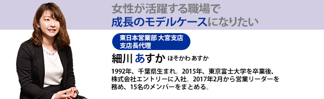これまでは、営業のリーダーを務め、15人ほどのメンバーをマネジメントしてきました。その成果が認められたのでしょうか。今年の2月からは、大宮支店の支店長代理を任されています。会社として、女性の支店長代理は初めてのケースということで、責任の重さを感じています。2年目で営業リーダー、3年目で拠点の責任者を任せてもらえる会社は、決して多くはないはずです。かつての同級生は、会うたびに責任が増していく私の成長ぶりに驚いているくらいです。