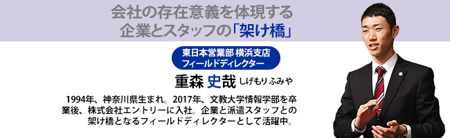 はい。いっしょに現場で仕事をしながら、勤怠管理から職場での注意事項、安全管理の徹底といった派遣スタッフのマネジメントをする仕事です。顧客企業に成り代わってスタッフを管理するのも私の仕事になります。いわば、顧客企業と派遣スタッフの「架け橋」になる立場です。私の仕事ぶり次第で、顧客企業からのエントリーに対する信頼性が大きく変わります。また、私が信頼関係を築けるか否かで、派遣スタッフの欠勤率や継続率にも影響が出ます。仕事の難しさを感じる反面、「エントリーの存在意義を左右する重要な仕事を任されている」という自覚もあります。