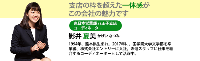 たとえ支店が変わっても、同じレベルのきめ細かな対応ができる誠実な人材が揃っていることです。派遣スタッフからの評判もよく、「どの支店でも対応が親切で、仕事選びの意欲がわく」との声が届いてきます。つながりのほとんどない遠くの支店メンバーとも、「いっしょにがんばっている」という感覚をもてるのはうれしいです。