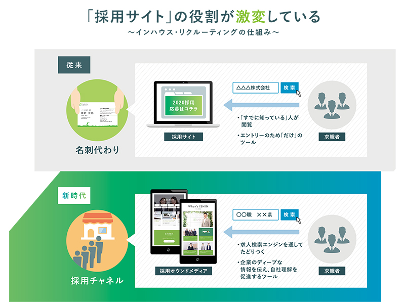 私たちイシンが提案しているのは「インハウス・リクルーティング」です。他社インフラに頼ることなく、自社が運営する採用メディアを通して人財を獲得することが核心になります。