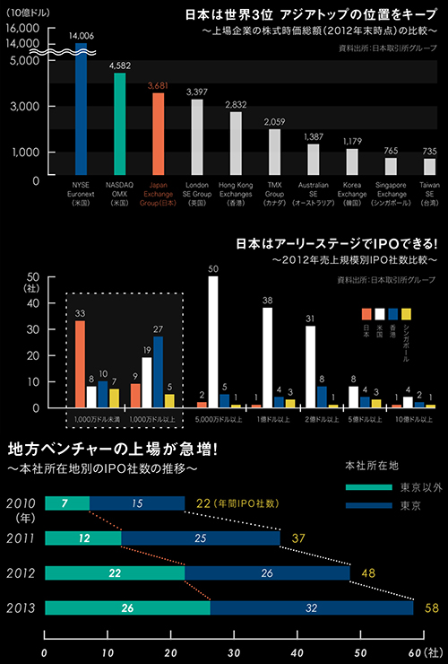 こうした地道な活動の効果もあって、東京以外に本社を置く企業のIPOが増えている。2011年には7社と、年間件数の3分の1程度だった地方企業のIPO。それが2013年には26社に増え、年間件数の半分近くにまで達している(右下図参照)。