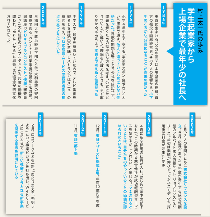 弱冠26歳。昨年11月、史上最年少の社長として東証一部に上場を果たしたのがリブセンス代表の村上氏だ。大学1年生だった2006年に起業。「成功報酬型の求人メディア」という新しいサービスが支持され、急成長を遂げた。今回は、企業理念や革新的なビジネスモデルが生まれた経緯、人材マネジメントなどについて、同氏に聞いた。