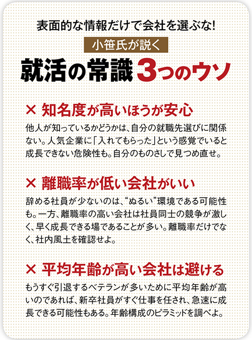 小笹:説明会や採用面接、インターン生の指導など、就活のあらゆる場面にトップが出てくるか、というのがひとつの判断基準になるでしょう。すべての場面に経営者が出てくるのは、新卒者の採用と育成に、トップ自らが深く関与しようという意思のあらわれ。入社した後も、トップのそばで仕事ができる可能性が高いんです。社員数の少ない会社、設立間もない会社も、必然的にトップの近くで仕事ができます。そういう会社は倒産するリスクも高いですが、起業するという目標があるなら、大企業に入る意味はまったくない。リスクをとって、経営者の仕事が学べる会社を選ぶべきでしょう。