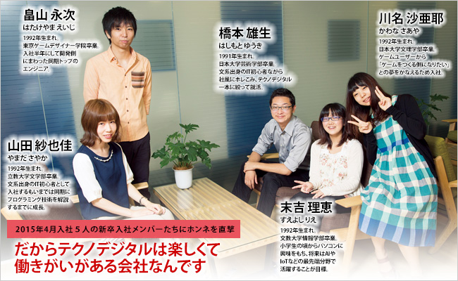 教育体制の充実など人材育成に力を入れ〝IT初心者〟でも安心して働ける環境を整備しているテクノデジタル。そこで2015年入社の新卒メンバーを直撃取材。実際の会社の雰囲気や入社後に気づいた点、2ヵ月研修の様子などを聞いた。