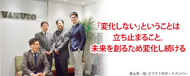 そのベンチャーでは得がたい経験もした。積極投資が裏目に出て、リーマン・ショック後に経営が傾いたのだ。「こうすればダメになる、という法則を学びました。その学びは、いまの自分にとって大きな財産です」(星山氏)。そして、そのベンチャーで出会った信頼できるボードメンバーたちと一緒にワクトを立ち上げた。「築きあげたものを捨て、自ら変化の渦中に飛び込むことは、自分にとって恐怖ではありません。変化しないということは、動きを止めて立ちつくしていること。そんな状態になることこそ、恐怖すべき。これからもワクトは変化し続けていきます」(星山氏)。