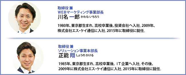 驚異の成長を遂げているエス・ケイ通信。その成功の陰には、主力事業を統括しながら、「大家族主義」の理念を組織の末端にまで落とし込み、進化の道筋を設計してきたふたりの経営幹部の存在がある。川名、正能両取締役だ。ここでは、強さのヒミツや今後の事業戦略などについて語ってもらった。