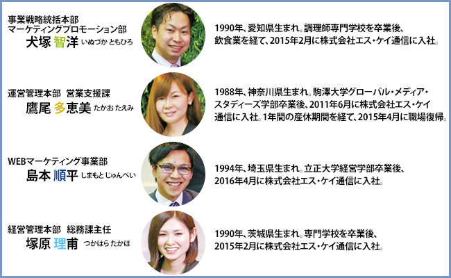 エス・ケイ通信の成長を語るうえで、現場の第一線で活躍する若手社員の存在を忘れてはならない。早くから大きな責任を担い、真摯に仕事に向き合う若手社員こそ、継続成長を遂げる同社の原動力にほかならない。ここでは、同社の未来を背負う若手4名を取材。仕事のやりがいや会社の魅力、さらには今後の夢などについて聞いた。