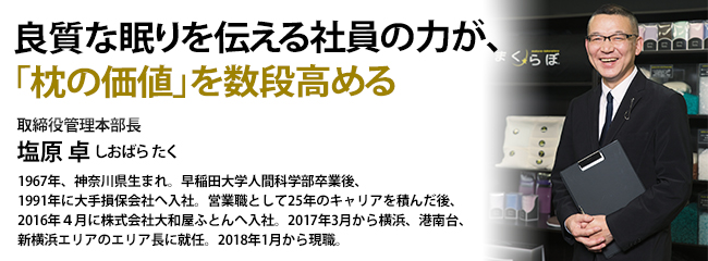 「オーダーメイド枕」を武器に、3年後のIPOをめざす大和屋ふとん。「顧客に良質な眠りを提供したい」という社員の強い想いが、会社の成長を加速させている。ここでは、総務と人事の責任者である塩原氏と、売上No.1店舗の店長として日々顧客に接している田中氏に、会社の魅力や仕事のやりがいについて聞いた。