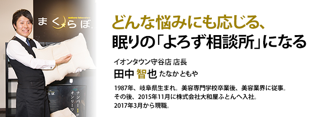 イオンタウン守谷店の店長として、5名の店舗スタッフとともに、月平均500名の顧客へオーダーメイド枕を提案しています。スタッフに伝えていることは、「つねに最善の提案ができるよう準備しておくこと」。そのためには、性別、年齢、体型などに応じた睡眠の悩みを体系化しておき、ヒアリング結果によってどのような提案をするかシミュレーションしておくことが必要です。そして、空き時間を見つけては、接客のロールプレイングも行う。顧客に満足して帰っていただき、「また来たい」と思ってもらえる店舗をめざしています。