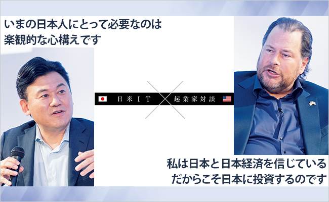 楽天の三木谷氏が代表理事を務める新経済連盟が、「Japan Ahead —集え、日本を牽引する力—」をテーマに4月11日にウェスティンホテル東京にて『新経済サミット』を開催。多数の起業家や著名人が、講演やセッションを行った。本企画では、三木谷氏とセールスフォース・ドットコムの会長 兼 CEOのベニオフ氏とのセッションを一部抜粋してレポートする。