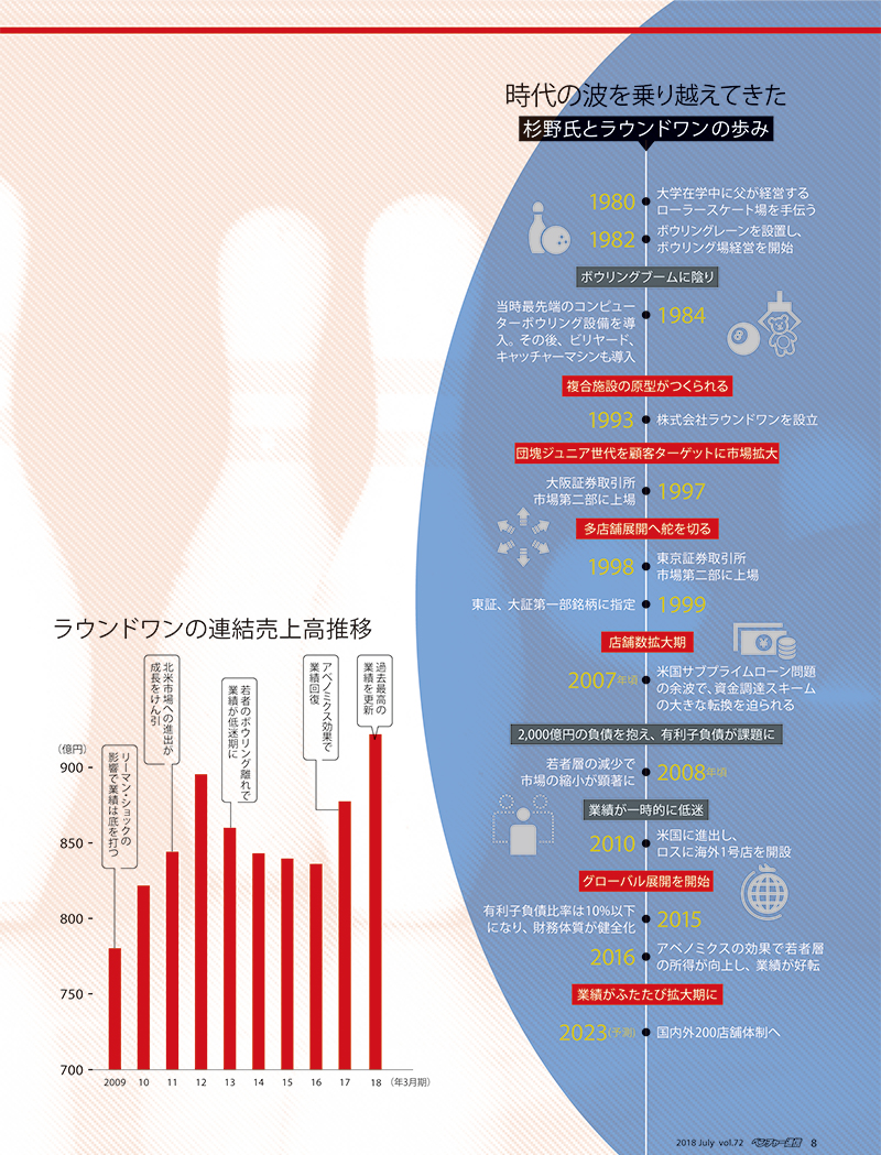 景気変動や流行といった時代の波に翻弄されやすいレジャー産業にあって、創業以来、業績の拡大を続け、いまや国内と北米で約130店の複合施設を運営するまでに成長したラウンドワン。前期も二度の上方修正を行い、過去最高の売上を更新している。その背景には、過度な多角化とは距離を置く代表、杉野氏の信念がある。同氏に、時代の変化の波を乗り切る経営術について聞いた。