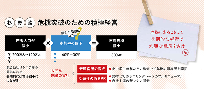 15年ほど前、ボウリング業界では団塊世代を対象に、「シニア層の取り込み」に力を入れました。当時は、「この層を取り込まなければ、その業界は滅びる」と、どの業界でも言われていた時代だったんです。しかし、シニア対策は即効性があるものの、団塊世代をピークに、ゆくゆくはシニア層でさえ減少傾向に入ります。結局は、若者層の開拓を疎かにしていれば、いずれ市場はシュリンクするだけ。ゴルフ場やパチンコ、マージャン業界がいい教訓です。