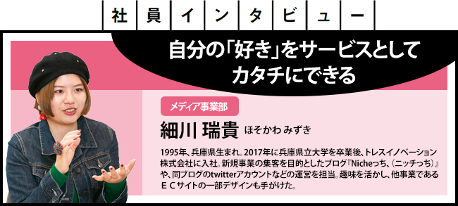 「アリの飼育」や「ゆで卵作り」といった珍しい趣味をもつ人や「ニッチな分野の市場」を紹介する『Nicheっち、』というブログを運営しています。ブログのコンセプトは、人間観察が好きな私が発案したものなんです。ブログのファンを集めることで、新規サービスの集客を図るのがいまの業務の目的です。