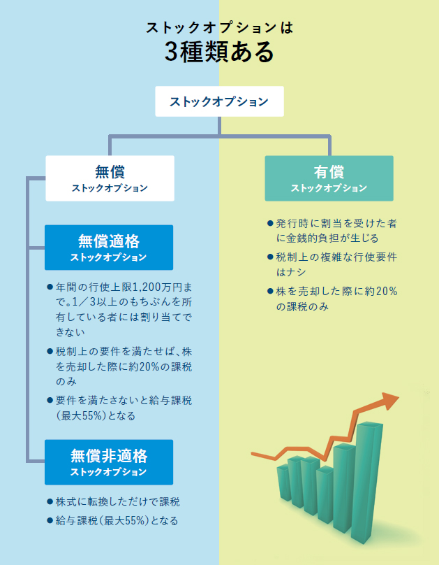 まずは、「無償SO」と「有償SO」に分けられる。これは「無償」「有償」という名の通り、受け取る側が最初にSOの対価として、現金の支払いを行うかどうかの違いになる。これだけを聞くと、「無償SO」のほうが、受け取る側にとって有利にみえるが、一概にそうとはいえない。