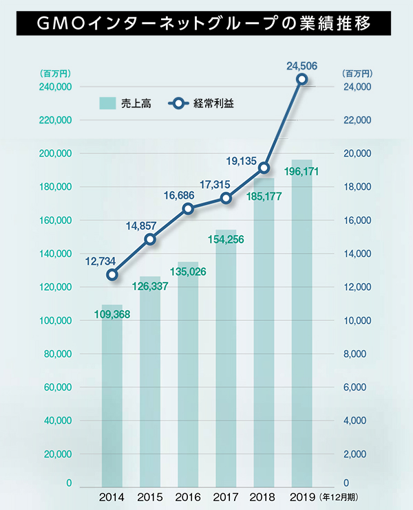 上場企業9社を擁し、グループ売上高は1,900億円を超える。いまや押しも押されもせぬ日本を代表するメガベンチャーといえるGMOインターネット。先ごろ発表された2019年12月期決算では、11期連続で過去最高益を更新し、その勢いは止まらない。しかし、代表の熊谷氏に笑顔はない。厳しい視線のその先に描く、会社の将来像とは。企業成長にかける想いや、将来ビジョンなどについて同氏に聞いた。