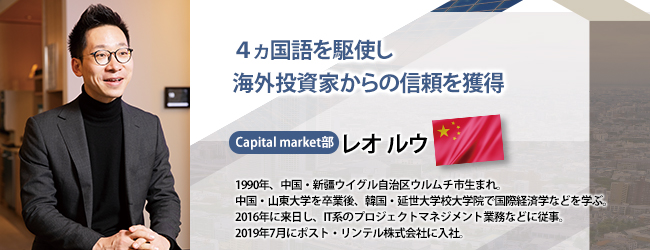 あるインタビュー記事で代表の坂東を知り、チャレンジ精神の強さに感銘を受けたのがきっかけです。飛び込みで会いに行き、「働きたい」と必死に想いを伝え、入社承諾をもらいました(笑)。現在は、日本語、英語、中国語、韓国語の4ヵ国語を話せるスキルを活かし、海外のファンドやリートに国内不動産物件を紹介しています。当社は、販売仲介のみならず、不動産開発の企画段階から建設、その後の運営・管理まで、ワンストップソリューションを提供しているので、まさに投資家の「パートナー」になった気持ちで顧客に向き合っています。
