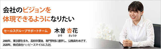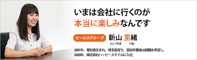 早くひとり立ちしたくて、高校受験のときからすでに決めてたんです。それで、私のひとつ上の先輩が、「ハッピースマイルに入社した」という話を先生から聞いていて。それで、合同企業説明会に参加したのが最初のきっかけですね。みなさんすごく明るい表情で、たんに業務内容を説明するだけではなく、「直接ありがとうと言ってもらえる仕事だよ」といったように、やりがいまで説明してくれて。ほかの会社も回ったんですが、そうした雰囲気がダントツに良くて、「もう絶対この会社に入ろう」って決めました。