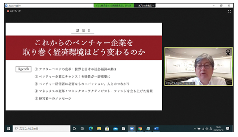 今年のカンファレンスでは、マネックスグループ取締役会長兼代表執行役社長CEOの松本氏が、基調講演を務めた。講演のテーマは、「これからのベンチャー企業を取り巻く経済環境はどう変わるのか」。新型コロナウイルス感染症の影響で、世界経済が第二次世界大戦以来の落ち込みを見せているなか、松本氏は「ルールが変わる混乱期はベンチャー企業にとって大きなチャンス」と指摘。同時に、成長ベンチャーの経営者に求められる資質などについても語った。