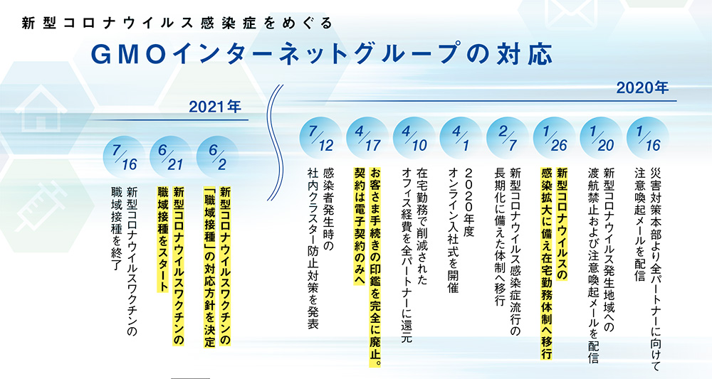 ええ。経営において、スピードは力です。あらゆる危機に際しては、トップ以外にだれも責任などとることができない。トップの責任でスピード感をもって、すべてを一気に動かすのが鉄則です。今回は、過去の呼吸器系ウイルスの致死率や感染の広がり、当時の武漢市をはじめ中国全体の状況、日本との関係性などを多角的に分析し、災害対策本部を立ち上げた翌日には在宅勤務への移行を決断。また、今年6月には、政府発表の翌日に新型コロナウイルスワクチンの職域接種の対応方針を発表し、7月半ばにはパートナーの家族やお取引先、地域の希望者を含め、約2万人の接種を実施し、職域接種の完了を宣言。どこよりも早く始め、どこよりも早く終了させる。それがトップに課せられた危機管理における責任だと思っています。