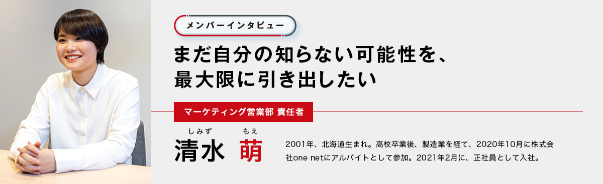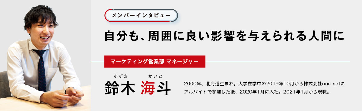 この間の経験から、私はone netは大きく成長する会社だと確信できるようになりました。その成長に貢献していく過程で、自分も部下や後輩に良い影響を与えられる人間に成長していきたいと思っています。