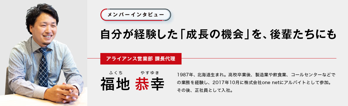 私は学生時代に先輩の紹介から、one netでアルバイトとして働いたのがきっかけでした。最初は、がんばった結果によって上がっていく成果報酬に魅力を感じていました。しかし、働いていくうちに、自分が目標に向かって強い意志をもてるように導いてくれる会社の環境づくりに魅力を感じるように。one netは、人材の育成を本当に大切にする会社なんです。どんどん仕事が楽しくなり、大学を辞めて、そのまま就職する道を選びました。