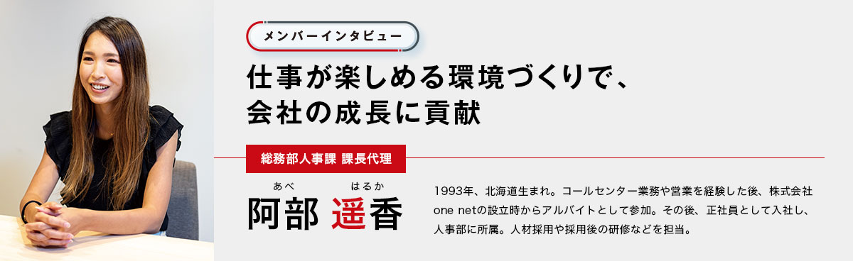 今後、事業も人員も拡大していくに伴って、メンバーの活躍の場が広がっていきますので、それをサポートする人事部門の役割もますます重要になっていくはずです。「ヒトがヒトを育む企業づくり」をビジョンに掲げるone netの人事部門として、一人でも多くのメンバーの笑顔をつくりながら、これからの会社の成長の一翼を担っていきたいと考えています。