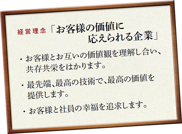 創業時に策定した「経営理念」は、つねに経営の指針として変わらず大切にしています。事業で迷いが生じた時などはここに立ち返り、決断の拠り所にしています。当社が経営理念として目指しているのは、「お客様の価値に応えられる企業」であり、そのために3つの方針を掲げています。それは、「お客様とお互いの価値観を理解し合い、共存共栄をはかります。」「最先端、最高の技術で、最高の価値を提供します。」「お客様と社員の幸福を追求します。」というもので、特に3つ目は「社員に対する約束」として大事にしています。