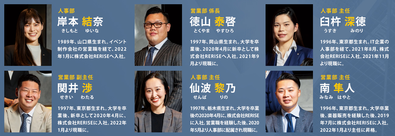 RERISEの成長を語るうえで、営業現場の第一線で活躍する若手メンバーの存在はなによりも重要なファクターだ。同時に、代表の田口氏が、「採用力こそ成長の原動力」と語るように、そうした優秀な若手人材をRERISEへと導いてきた採用担当者の存在も忘れてはならない。ここでは、同社の未来を背負う営業の若きホープ3名と、人事担当者3名による座談会を実施。それぞれが感じる仕事のやりがいや、RERISEの魅力などについて語ってもらった。
