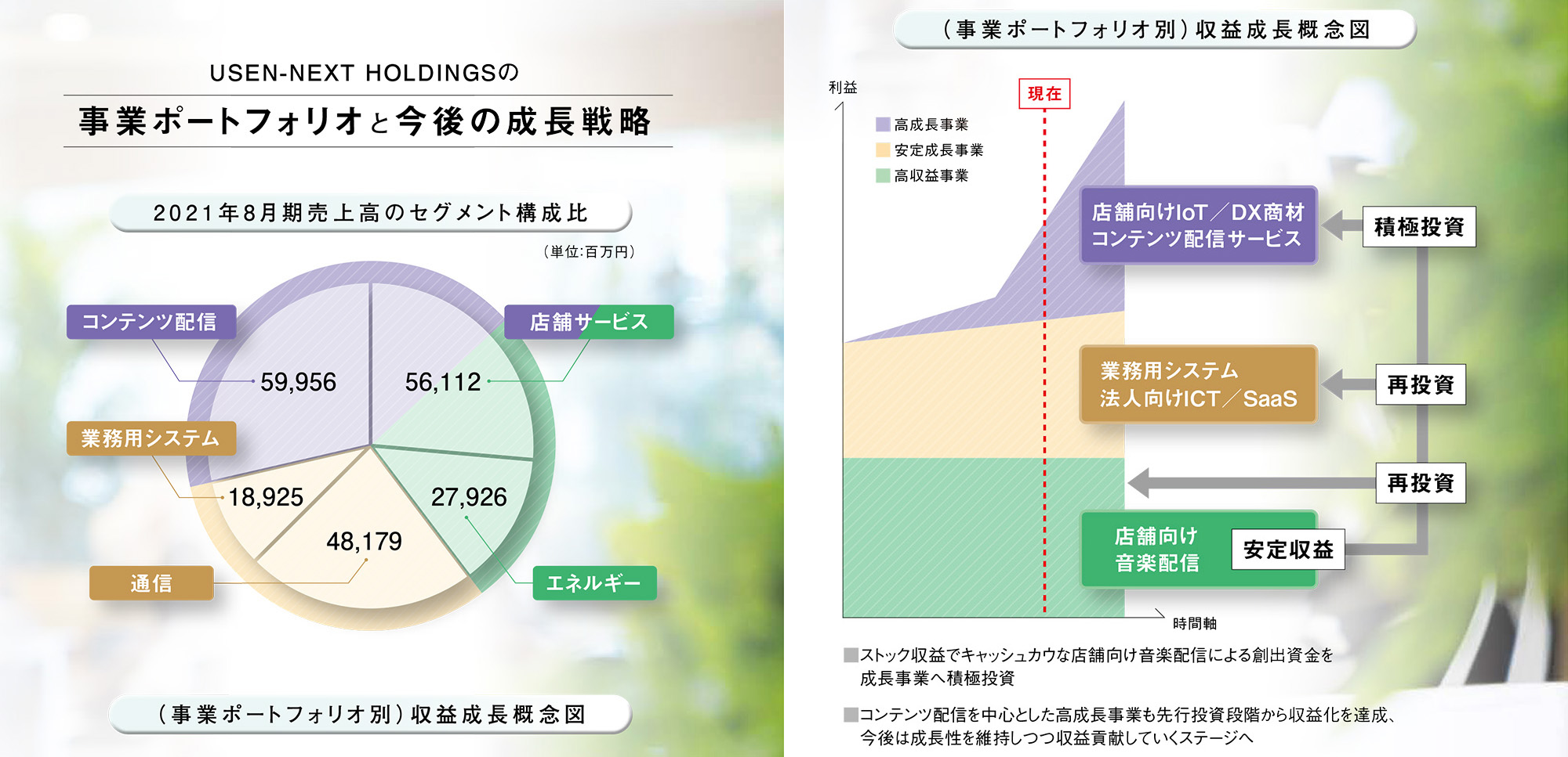 今後は、USENを中心とするストック型の「高収益事業」で得られた収益を、業務用システムなどの「安定成長事業」への再投資や、コンテンツ配信やDX商材といった「高成長事業」への先行投資に向けていきます。ステージの異なる各事業がそれぞれ連動しながら、グループ全体として収益成長させていくモデルです。