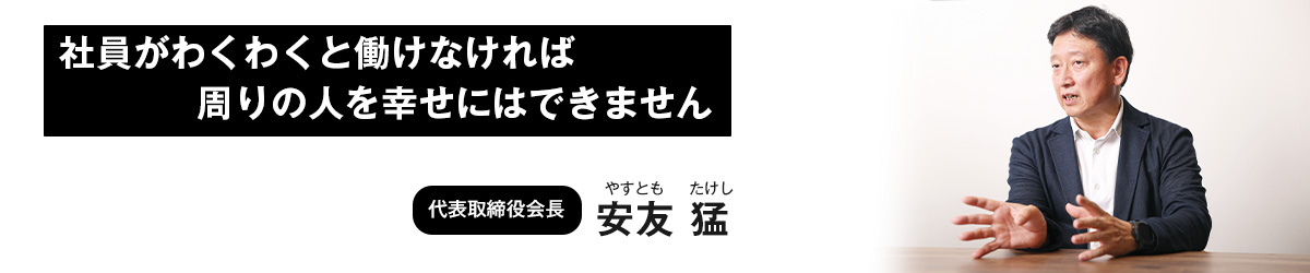 安友:「今を楽しもう、わくわくする未来に」です。当社で働く社員がわくわくしながら仕事ができる集団でなければ、お客さまはもちろん、家族や仲間といった周りの人を幸せにすることはできないと考えているのです。
