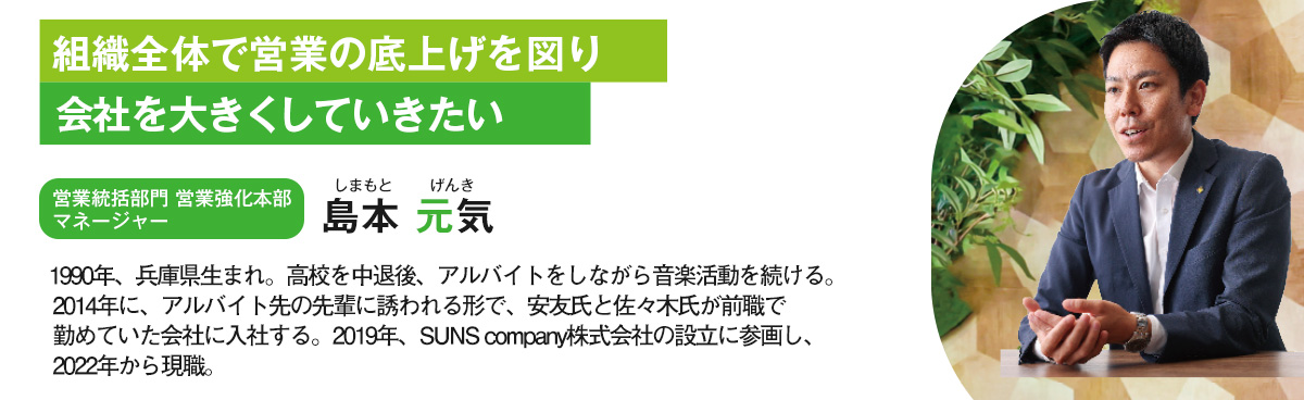 平均年齢が約30歳というSUNS companyには、同社の成長をけん引している中核メンバーが存在する。このページではそうした中核メンバー2名に、会社の魅力や今後の目標などを聞いた。