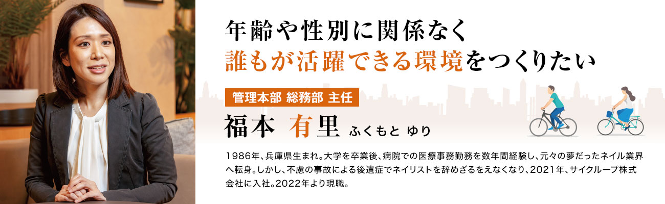 気兼ねなく意見を言い合えるところが当社の魅力だと話しましたが、会社に長くいるメンバーだけでは意見が凝り固まってしまうことがあります。そのため、現状の課題を解決し、会社のさらなる成長を促していくには、新しい人材の意見やアイデアが重要になってきます。当社では、今後さらに事業を拡大させ、上場も目指しています。一緒にさまざまなことにチャレンジし、サイクループとともに成長したい人には、ぜひメンバーに加わってほしいですね。