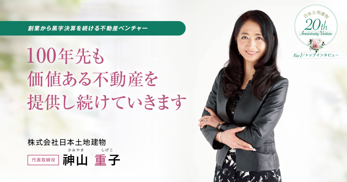 不動産再生事業をメインに手掛けている、日本土地建物。創業以来19期連続で黒字決算を達成し、20期目も黒字決算を見込んでいる。「社員やお取引先様とともに助け合いながら仕事をしてきたことが、持続的な経営につながっている」と話す代表の神山氏。今後もその方針は変わらないものの、新しいことにもチャレンジしていくという。同氏に、持続的な経営によって今年で20周年を迎えられた理由や今後のビジョンなどを聞いた。