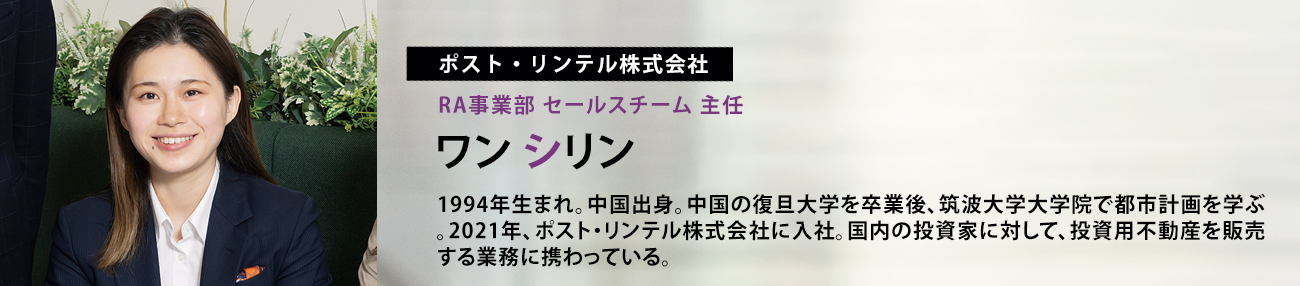 ワン:確かに、みなさんプロ意識は強いです。私は大学と大学院で、都市計画を学びました。入社前に先輩社員と話す機会があり、まちづくりの考え方について質問したら、不動産に関する豊富な知識をもとに、みなさんすごくしっかりとした意見を持っていました。