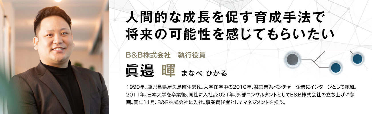 もともと私は、事業を開始した2021年1月から人事採用部門のコンサルタントとしてB&B社にかかわっていたのですが、事業をさらに強化していく段階で、「より深く会社にコミットしてほしい」と代表の髙橋から誘ってもらったのです。私自身も、現場でより深く人材育成に携わりたいという想いがありましたし、「会社の成長をより間近で実感できる」という髙橋の言葉に魅力も感じ、2021年11月に入社しました。