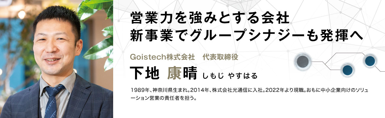 私はもともと、前職時代にパートナー企業の事業責任者としてY&I Groupと関係を持っており、現在Goistechが展開するOA機器などの法人営業事業をともに展開していました。そうしたなか、Y&I Groupが法人営業部門を強化し、グループ会社化する方針となった際に、その代表職として私に声をかけてくれたのです。その後、2022年9月のGoistech設立に合わせてY&I Groupに参画することになるのですが、その際、私は迷うことなく入社を決めた経緯があります。というのも、事業パートナーとして外からY&I Groupを見てきたなかで、会社にとても魅力を感じていたからです。