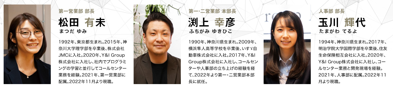 前ページでは、Y&I Groupにおける「成長の要因」とされる充実した人材育成体制について、責任者である執行役員の隼田氏に聞いた。同氏は、「社内の各事業部門を統括する本部長・部長陣は、その人材育成のひとつのモデルケース」だと語っている。そこでこのページでは、その本部長・部長陣のなかから、成長をけん引するキーパーソン3名を取材。現在までの歩みや、仕事のやりがいなどについて語ってもらった。